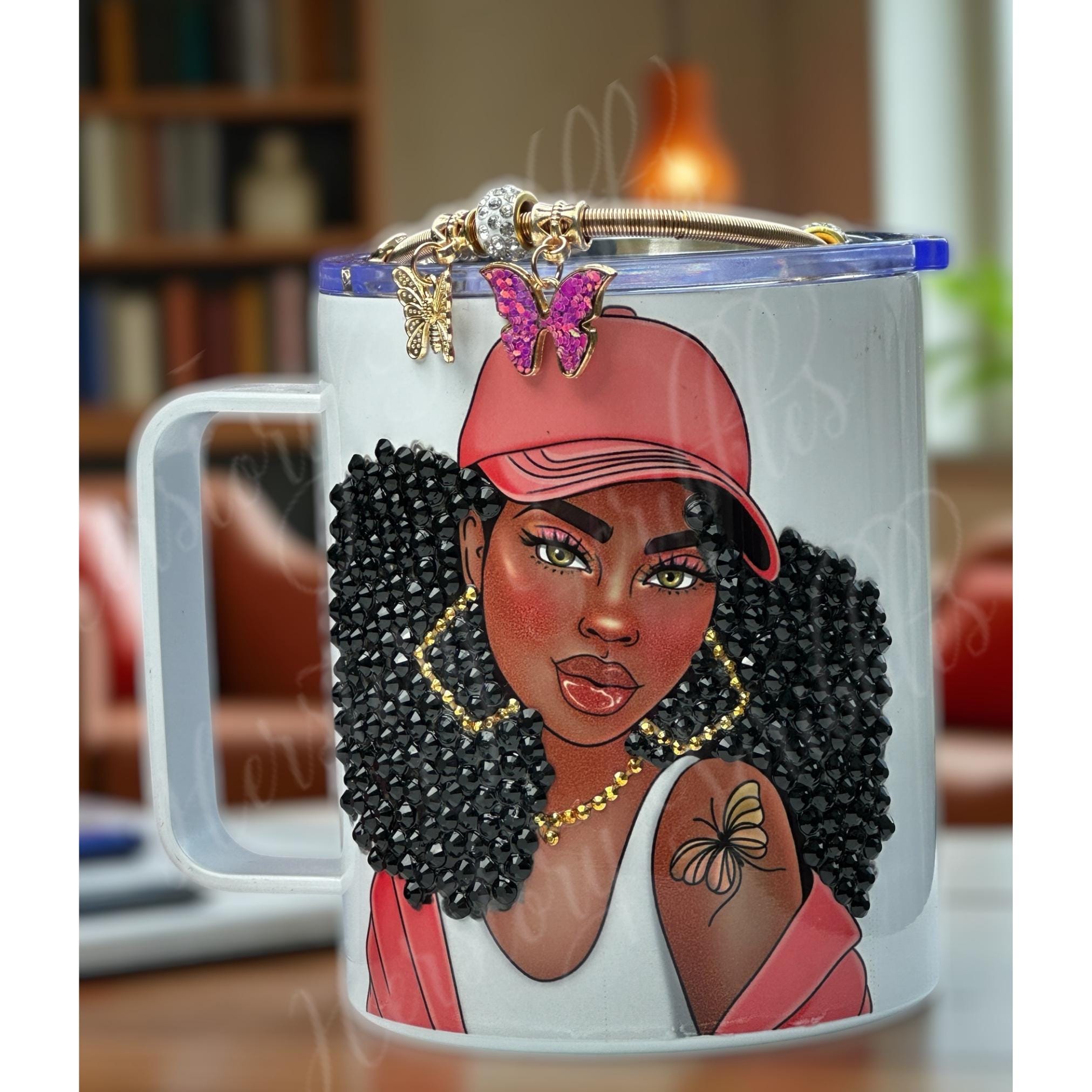 • 12 oz rhinestone mug with vibrant Black woman illustration