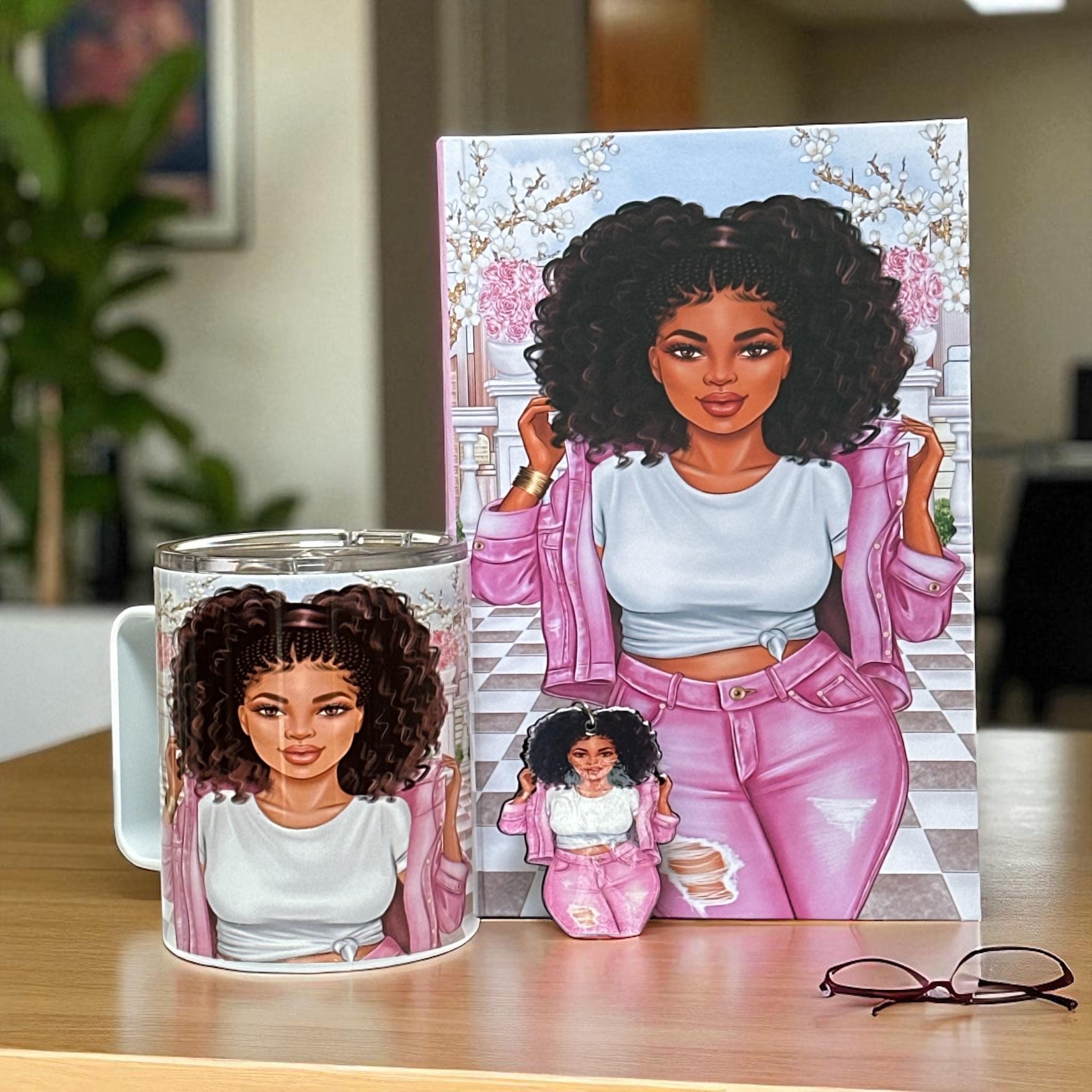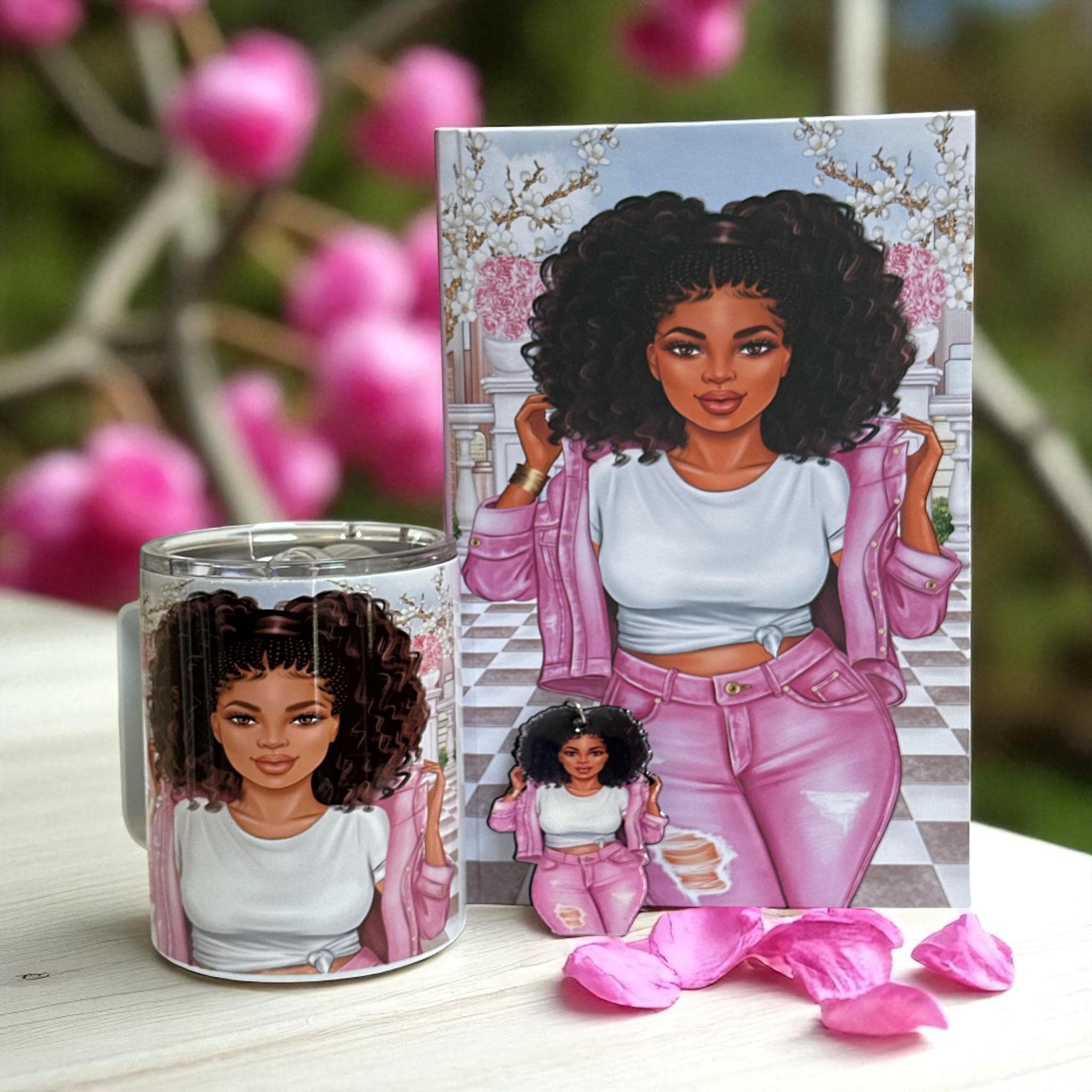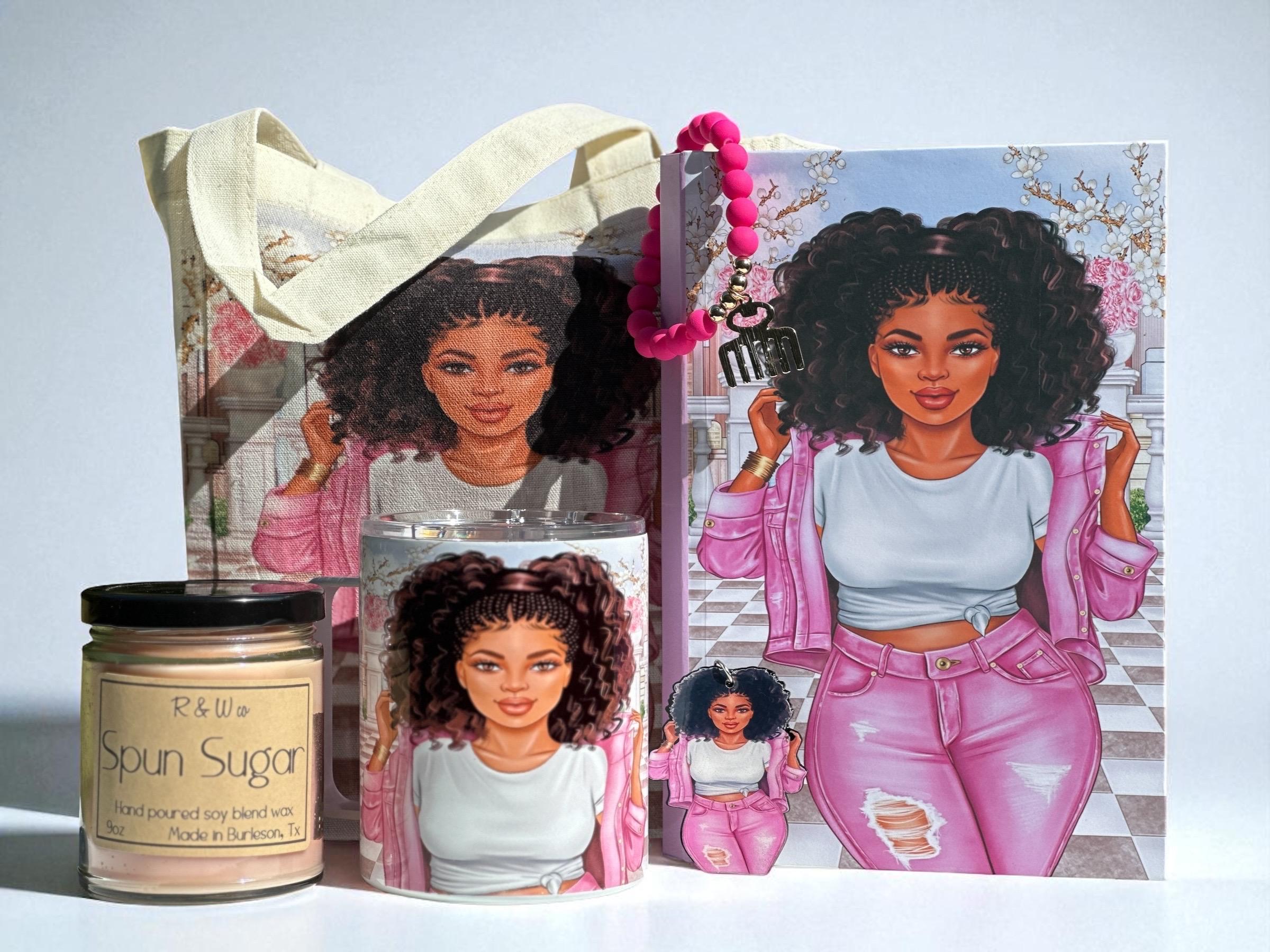 Step into self-care and style with this full HERSTORY Scribbles gift experience. This handmade hardcover journal set includes a 15oz matching ceramic mug, 9oz Sugar Spun scented candle, beaded bracelet, and matching keychain — all designed to coordinate with our exclusive Afrocentric illustration of a stylish Black woman in a pink outfit against an elegant garden backdrop.