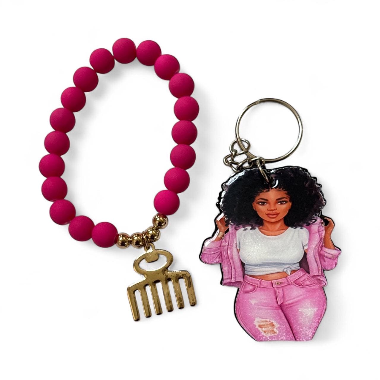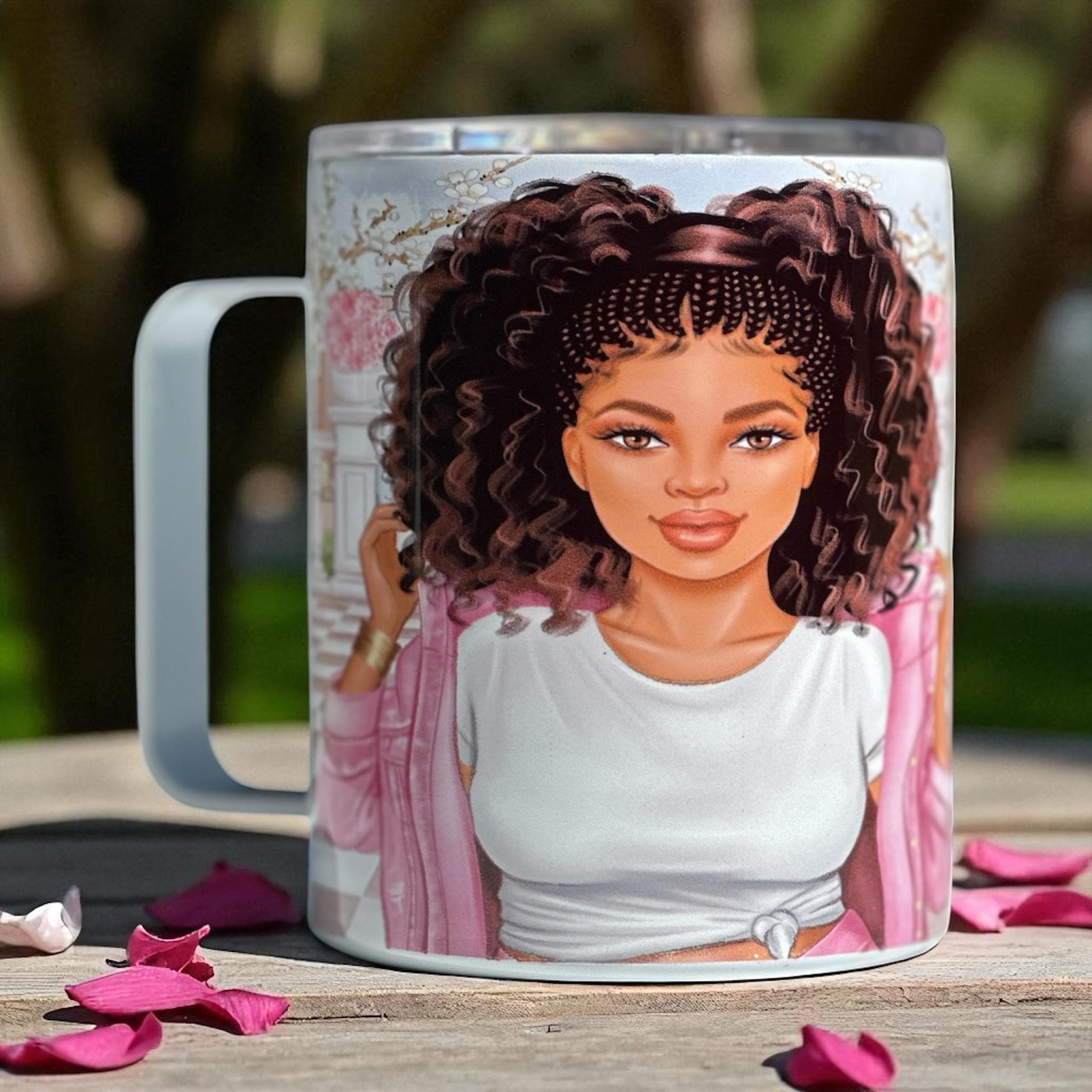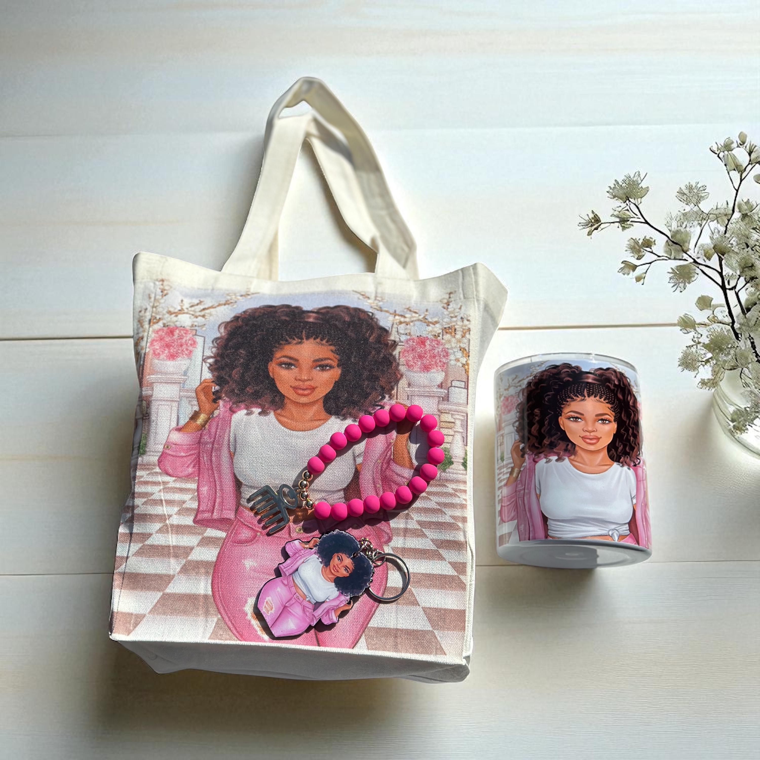 Step into self-care and style with this full HERSTORY Scribbles gift experience. This handmade hardcover journal set includes a 15oz matching ceramic mug, 9oz Sugar Spun scented candle, beaded bracelet, and matching keychain — all designed to coordinate with our exclusive Afrocentric illustration of a stylish Black woman in a pink outfit against an elegant garden backdrop.