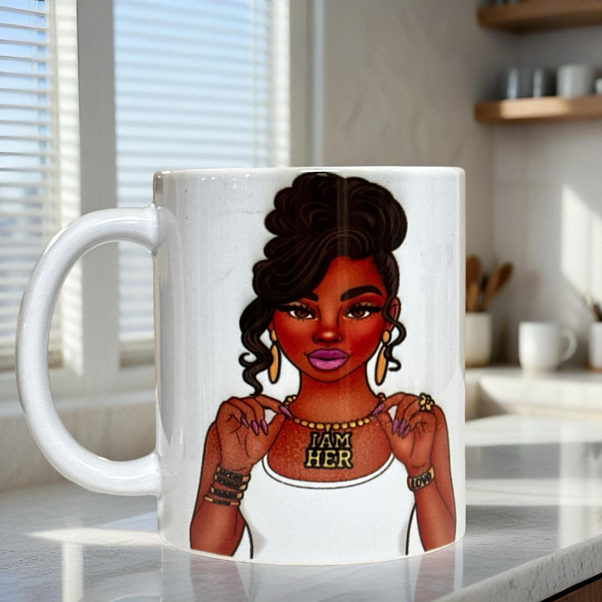 The design features a beautiful Black woman with a high bun, gold jewelry, and fierce, feminine energy. Every detail speaks to strength, self-worth, and grace — making this the perfect gift for any woman walking boldly in her truth.