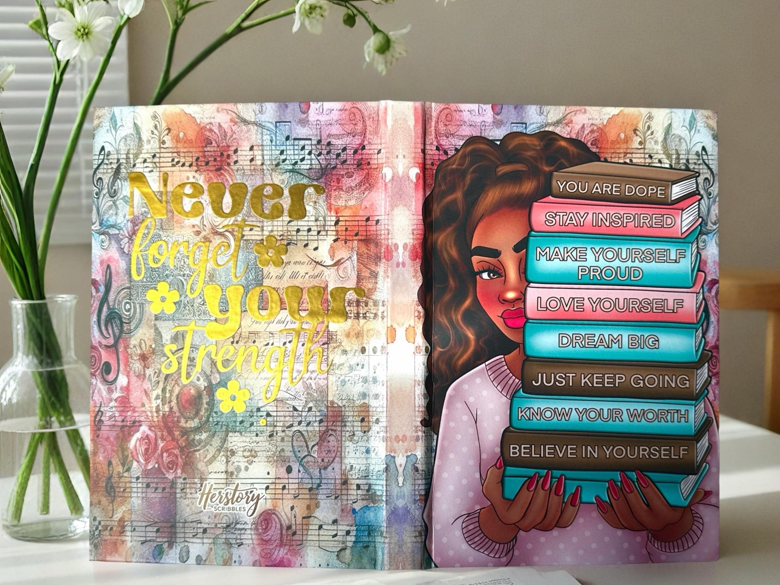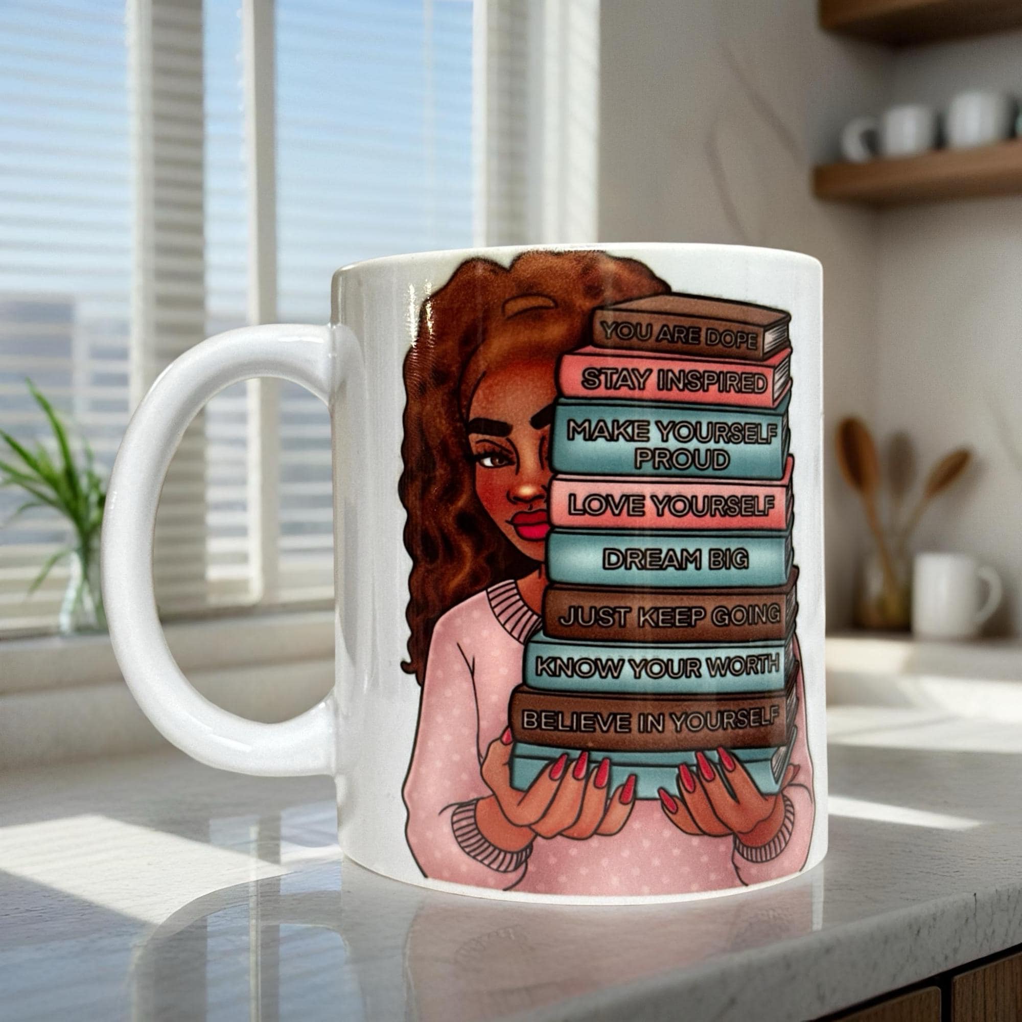 Featuring a beautifully illustrated Black woman holding a stack of empowering books — each with affirmations like You Are Dope, Dream Big, Know Your Worth, and Believe In Yourself — this set is a love letter to every queen on her journey.