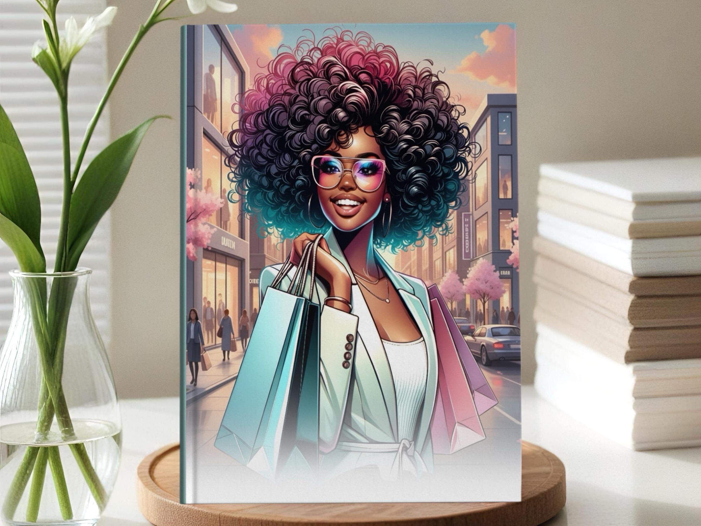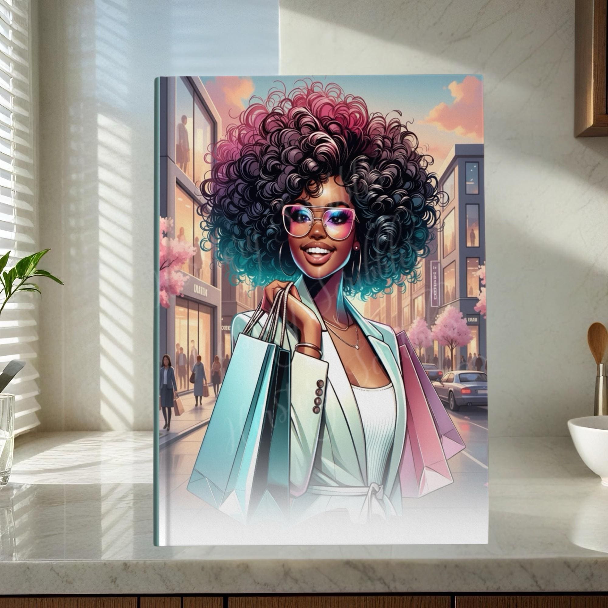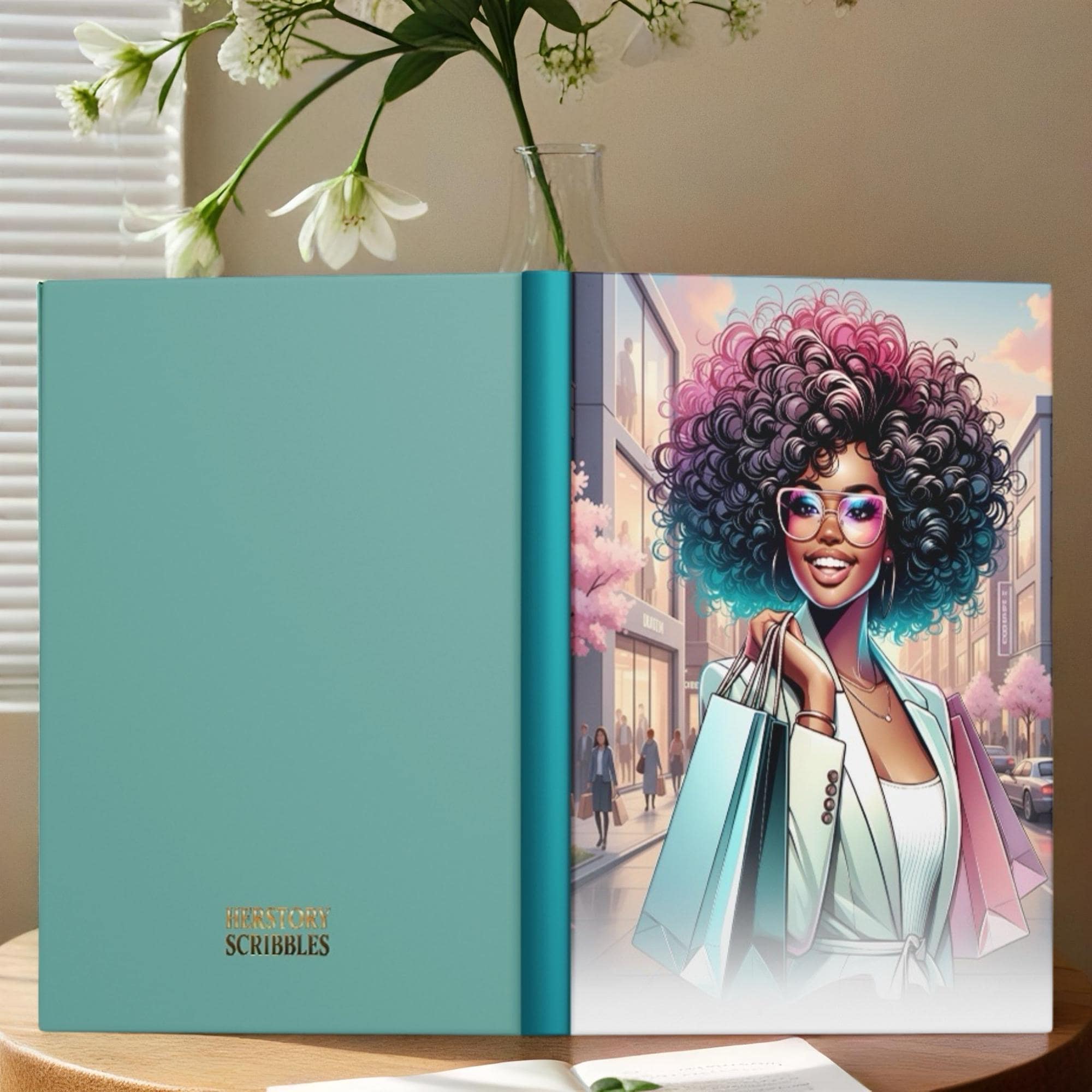 This Afrocentric Black Woman Journal from HERSTORY Scribbles celebrates confidence, creativity, and self-care. Featuring a stunning illustration of a fashionable Black woman with voluminous curls, glowing skin, and shopping-day confidence, this chic teal hardcover notebook inspires you to pour your thoughts, dreams, and affirmations onto the page.