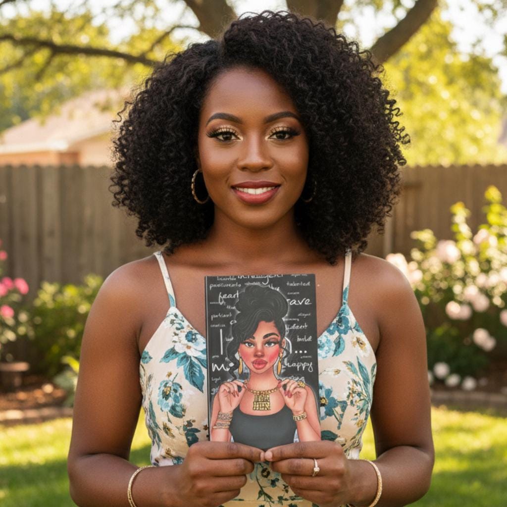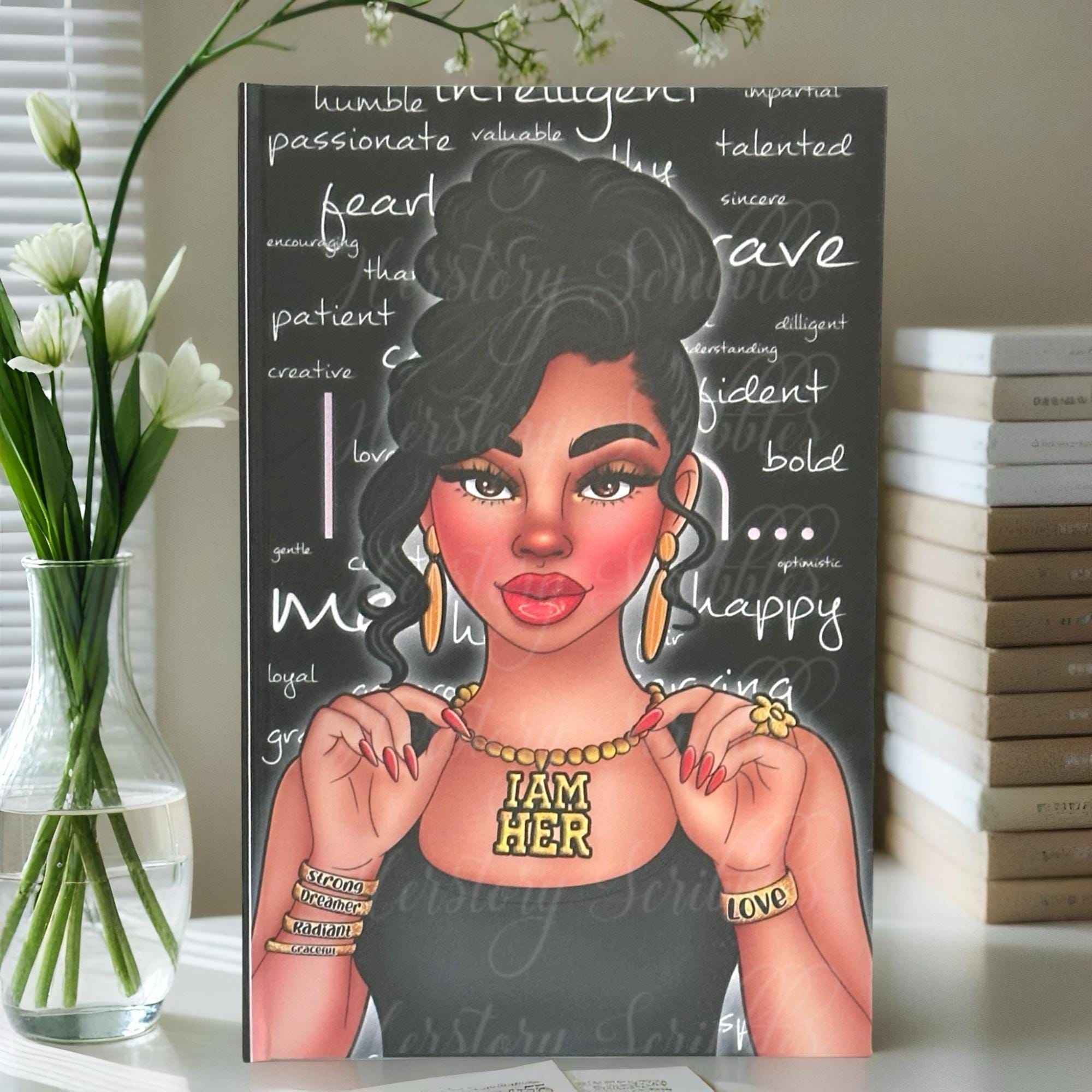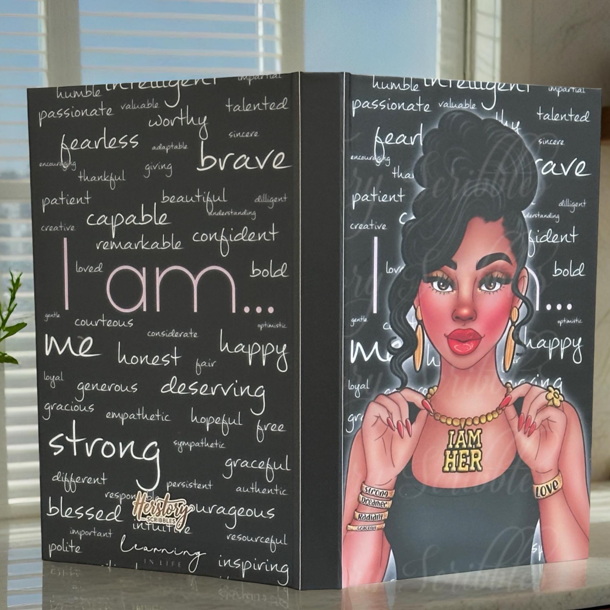 This striking hardcover journal celebrates confidence, power, and self-love. Featuring a stunning illustration of a stylish Black woman surrounded by affirmations, this notebook is a daily reminder that you are strong, capable, and enough—just as you are. Perfect for journaling, goal setting, or simply reclaiming your peace one page at a time.